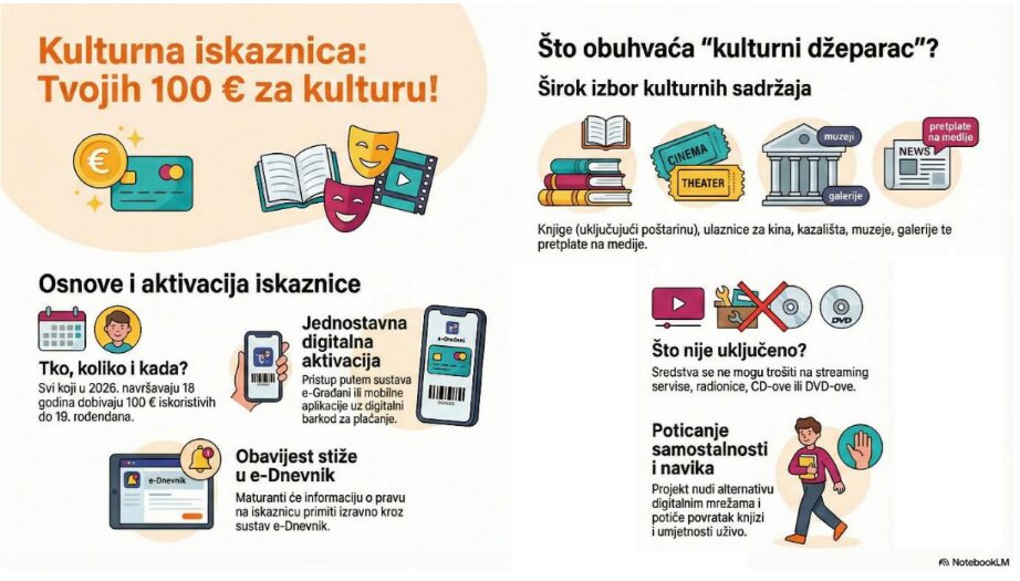 Pravo na Kulturnu iskaznicu ostvaruju svi mladi koji u 2026. godini navršavaju 18 godina. Svaki korisnik dobiva vrijednosni kupon u iznosu od 100 eura. Početak korištenja Kulturne iskaznice predviđen je za travanj 2026. godine, a odobreni iznos mladi mogu koristiti tijekom godine dana, točnije do svojeg 19. rođendana. Više informacija pronađite u priloženom dokumentu.